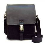 De cuero y algodón lavado, hecho a mano. Cierre con cremallera, amplio bolsillo exterior. Correa regulable.